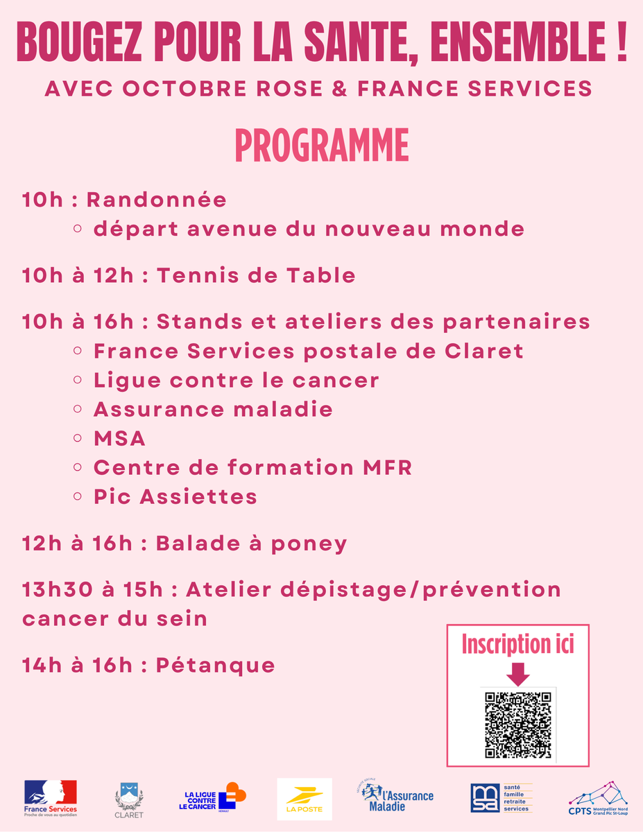 De 10h00 à 16h00, autour et dans la salle polyvalente, en parallèle du marché, venez participer à l'événement "Octobre Rose et la France Services de Claret : Bougez pour la Santé, Ensemble !".