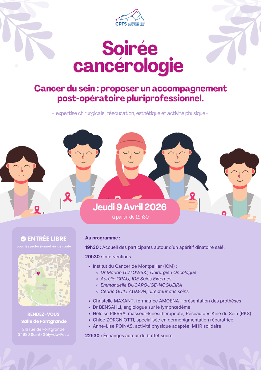La CPTS Montpellier Nord Grand Pic Saint Loup vous invite à une soirée conviviale réservée aux professionnel·le·s de santé, pour un temps d’échanges et de partage d’expériences autour de l'accompagnement post-opératoire pluriprofessionnel du cancer du sein:
